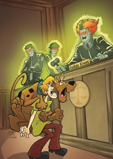 'SCOOBY AND THE GANG ON TRIAL--FOR MEDDLING?! Mystery Inc. never expected that when they went to investigate a haunted courtroom, they'd wind up prosecuted by a ghostly judge. Unless they can unmask the gavel-wielding ghost and clear their names, they might just get sent up the river...Styx!'