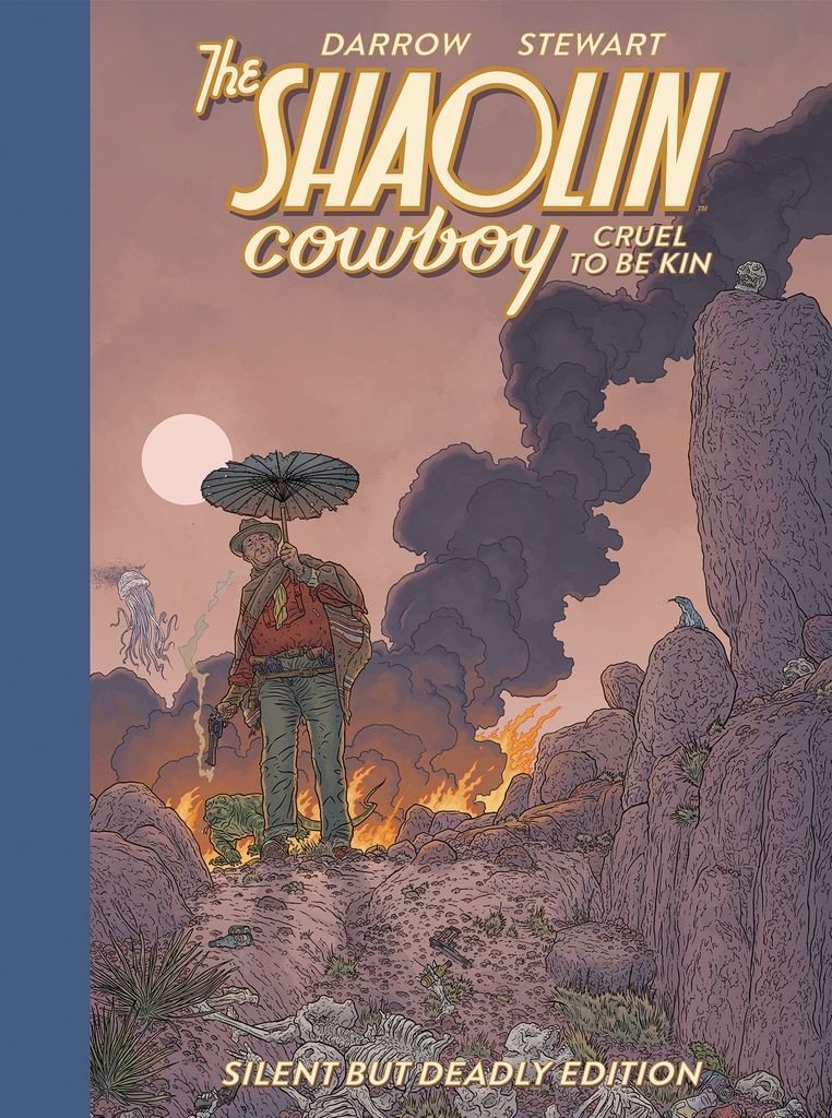 If a picture is worth a thousand words, then more than 205 pages of the stupendous and technicolor art of Dave Stewart and the dubious letterless box drawings of Geof Darrow must be worth at least... well, you do the math. But that's what you are going to get when Dark Horse presents the king-size Silent But Deadly edition of the The Shaolin Cowboy epic 'Cruel to Be Kin.' No words to slow you down, no philosophy to burden your tic-tocked brain-just pure unadulterated and uncensored, pedal to the metal, full color, kung fu, six gun, barn-burning action as only Stewart and Darrow can deliver. No valium nor Xanax can help you with this pulse-pounding tome. If you think you know the whole story you don't! So light a match and crack open the window of your imagination and take a deep breath! Collects The Shaolin Cowboy: Cruel to be Kin #1-#7 (without lettering).