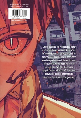 Le jour où Akio a été vendu par sa mère, il a dé abandonner son nom. Aujourd'hui, il s'appelle Serpent, il a treize ans, et il est tueur à gages. Régulièrement hanté dans ses rêves par le souvenir de ses victimes, il fait alors la rencontre de Lynne, une jeune femme aveugle. Désireux de gagner l'argent nécessaire à l'opération des yeux de celle-ci, il accepte une mission particulièrement dangereuse...