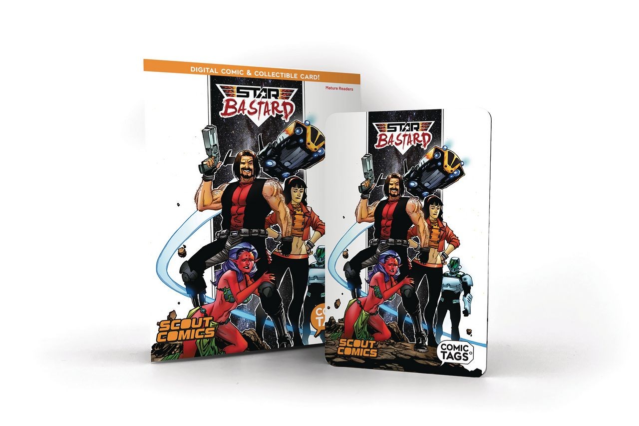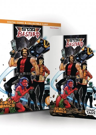Making digital comics collectible! This plastic collectible card that contains a PDF of the complete Star Bastard graphic novel! Star Bastard follows a long-suffering mercenary crew as they stumble through the universe under the clumsy command of the loud, obnoxious (and invulnerable) Captain Greeves. Searching for clues to Greeves' shadowy past, they leave a trail of lizard bounty hunters, angry alien empires and unpaid bar tabs in their wake. Collecting all six issues of the foul-mouthed, over-the-top sci-fi romp, equal parts Red Dwarf and grain alcohol.