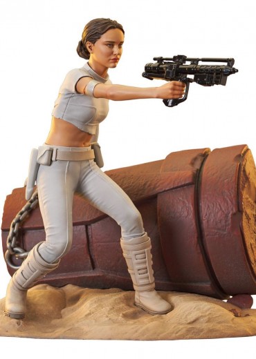 A Gentle Giant Ltd. release! All hail the Queen! Nabooan queen-turned-Senator Padme Amidala charges into battle in this new Premier Collection sculpture from the artists at Gentle Giant Ltd.! Wielding a blaster as she escapes from her chains in the arena on Geonosis, this statue of Padme features the likeness of Natalie Portman and stands approximately 9 inches tall. Limited to only 3000 pieces, it comes packaged in a full-color window box with a numbered certificate of authenticity.