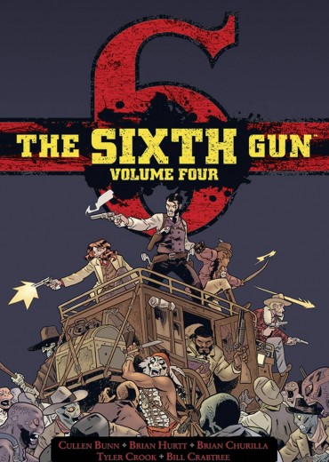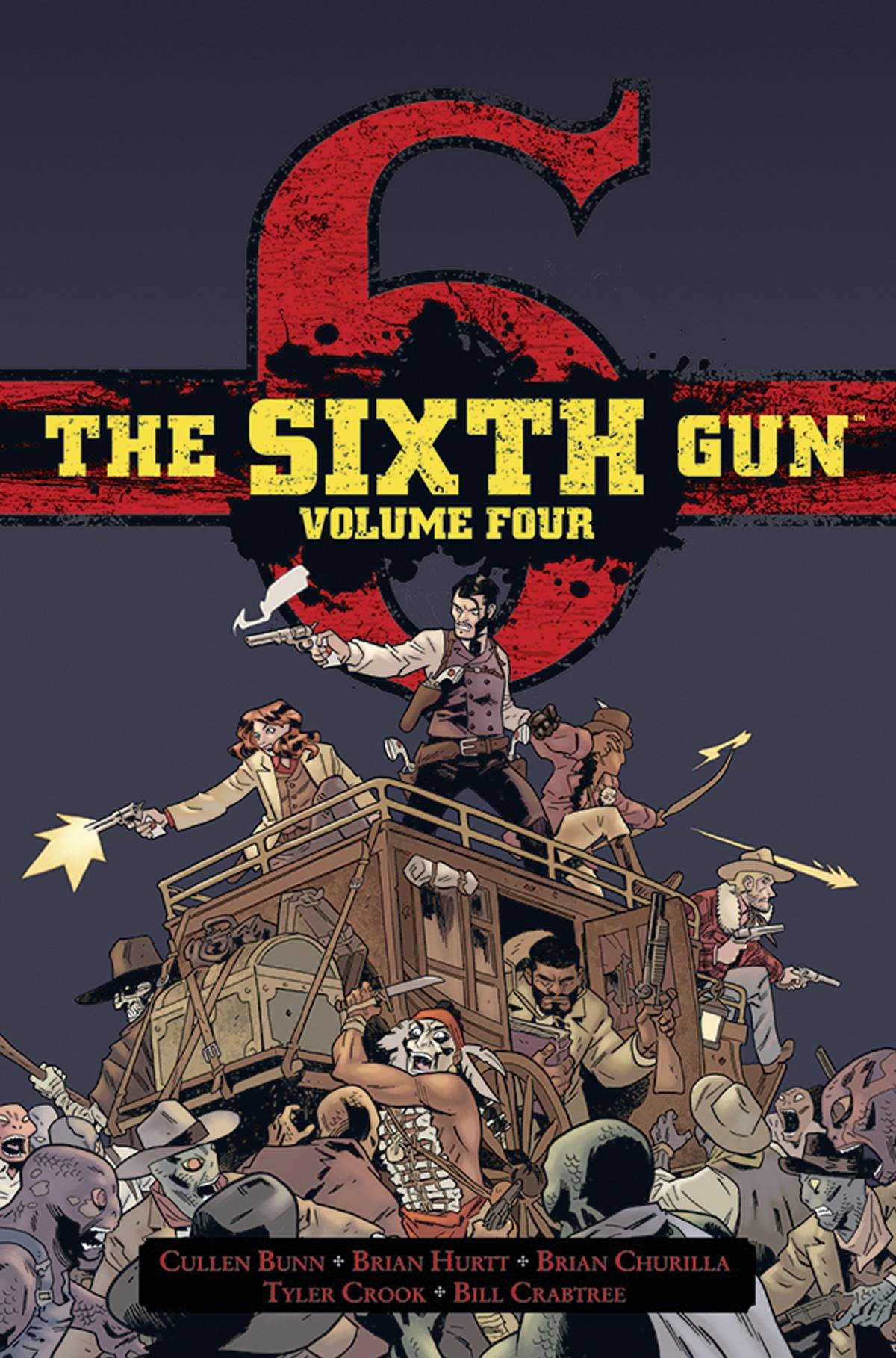 The Sixth Gun Volume Four Hardcover, collects issues 36 through 41, featuring the Not The Bullet, But The Fall story arc of the ongoing series by Cullen Bunn, Brian Hurtt, Tyler Crook, and Bill Crabtree, as well as the five issue spin-off mini-series Sons of the Gun with guest artist Brian Churilla. This oversized deluxe collection includes never before seen artwork, design sketches, cover galleries, an introduction by Usagi Yojimbo creator Stan Sakai, and more, from the Eisner-nominated fantasy western epic.