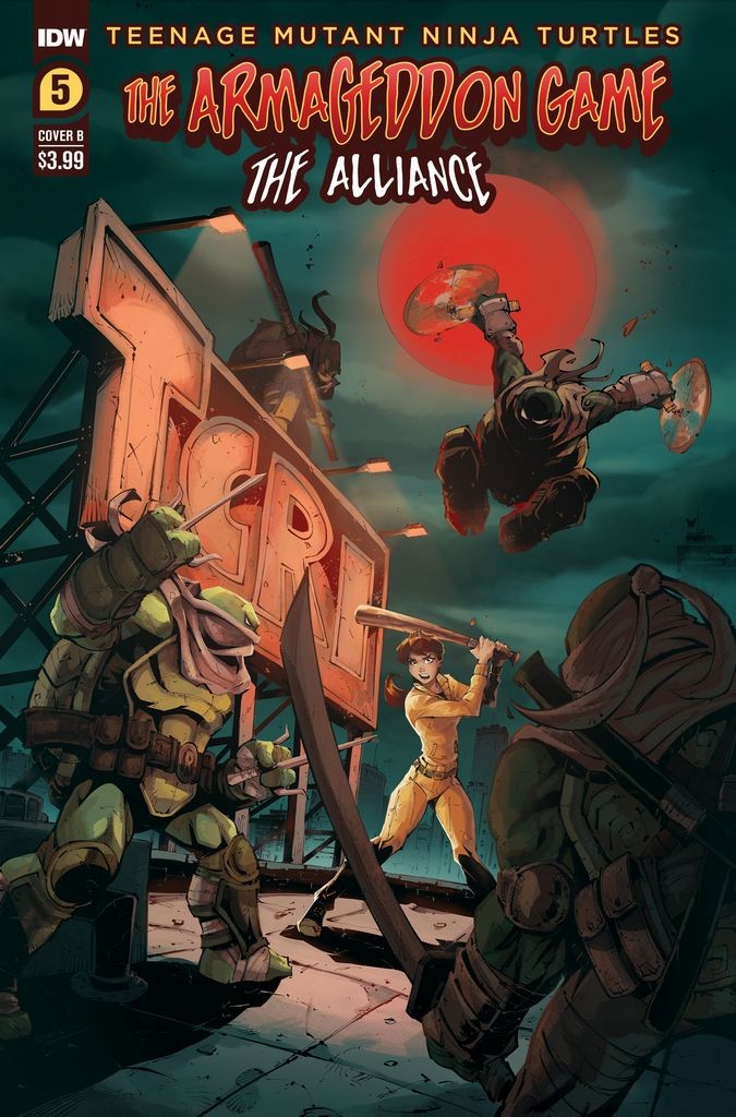 A team of imposter mutant ninja turtles, puppeteered by the Rat King, have sown discord across the city, turning everyone against the real TMNT. Now, armed with a lead on the true identities of the pretenders, April O'Neil is set on turning the tide in this war of disinformation. To uncover the truth, April must enter the smoldering ruins of TCRI-which was all but destroyed by the fake TMNT-and to do that, she'll need the help of an old enemy… Even if she's successful, will the world believe what she has to say, or will chaos reign? Lines are drawn in the sand as the The Armageddon Game nears its epic conclusion!