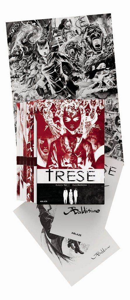 : Get all volumes of TRESE, the award-winning Filipino smash-hit, in this box set, including a bookplate signed by the creators alongside a sketch by artist Kajo Baldisimo! When the sun sets in the city of Manila, don't you dare make a wrong turn and end up in that dimly- lit side of the metro, where blood-sucking aswang run the most-wanted kidnapping rings, where gigantic kapre are the kingpins of crime, and magical engkantos slip through the cracks and steal your most precious possessions. When crime takes a turn for the weird, the police call Alexandra Trese. The Trese Volume 1-6 Box Set contains the first 6 volumes of the bestselling, critically acclaimed Filipino horror series, collected into an attractive box set compilation, and includes a folded bonus poster, featuring original box/poster designs by series artist Kajo Baldisimo. Each volume in the series features updated/remastered artwork, as well as extra material, including Alexandra's journal entries chronicling her creature encounters and more.