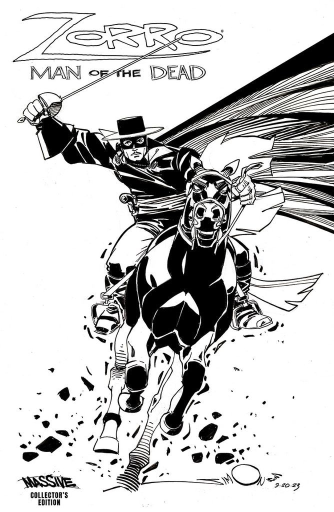 Legendary artist Walt Simonson, best known for his run on Marvel's Thor, along with countless other credits across the entire industry, delivers this iconic cover of the legendary masked crusader. Don Quixote meets Narcos in Sean Gordon Murphy's Zorro: Man of the Dead. In this modern reimagining, the writer-artist behind DC Comic's Batman: White Knight, delivers a fresh take on the legendary swashbuckling hero. Zorro has returned! Well, kind of. Diego has shown that the spirit of Zorro flows through him and has left a trail of ne'er-do wells in his wake. But now Rosa must try to save her brother who believes he is the protector of La Vega, as El Rojo will certainly be hunting for the legendary Zorro now. But Diego isn't going anywhere without Bandido. Hop in Rosa's El Camino, and prepare for the next swashbuckling chapter in Sean Murphy's electric story of the man in black.