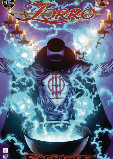 The explosive conclusion to ZORRO: SACRILEGE is here! Faced with the prospect of either exorcising the possessed inhabitants of the town or killing them all to free their souls, Zorro must sacrifice everything to destroy the evil once and for all! This is blazing supernatural action like you have never seen before as a legendary hero must face the very legions of Hell! ZORRO: SACRILEGE #4 comes with three covers: Main and Variant by Mike Wolfer, and a 350-copy Limited Edition B&W 'Visions of Zorro' cover, also by Wolfer.