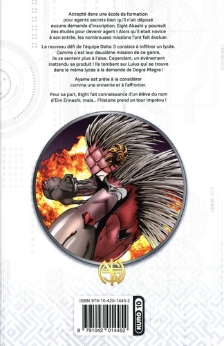 L'auteur de K en-Ichi, le disciple ulti me nous régale avec une comédie scolaire dynamique et renversante dans un lycée pour agents secrets. Accepté dans une école de formation pour agents secrets bien qu'il n'ait déposé aucune demande d'inscription, Eight Akashi y poursuit des études pour devenir agent ! Alors qu'il était novice à son entrée, les nombreuses missions l'ont fait évoluer. Le nouveau défi de l'équipe Delta 3 consiste à infiltrer un lycée. Comme c'est leur deuxième mission de ce genre, ils se sentent plus à l'aise et moins nerveux. Cependant, un événement inattendu se produit ! Ils tombent sur Lulus qui est dans le même lycée à la demande de Dogra Magra ! Ayame est prête à la considérer comme une ennemie et à l'affronter, mais la réaction de Lulus est... Pour sa part, Eight fait connaissance d'un élève du nom d'Eini Erinashi, mais... l'histoire prend un tour imprévu ? !!