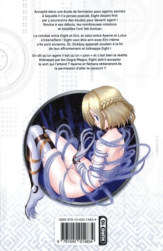 L'auteur de K en-Ichi, le disciple ulti me nous régale avec une comédie scolaire dynamique et renversante dans un lycée pour agents secrets. Accepté dans une école de formation pour agents secrets à laquelle il n'a jamais postulé, Eight Akashi finit par y poursuivre des études pour devenir agent ! Novice à ses débuts, les nombreuses missions et batailles l'ont fait évoluer. Le combat entre Eight et Eini, et celui entre Ayame et Lulus s'intensifient ! Eight veut être ami avec Eini même s'ils sont ennemis. Or, Sickboy apparaît soudain à la fin de leur affrontement et kidnappe Eight ! On dit qu'un agent n'est qu'un " pion " et c'est bien la réalité. Kidnappé par les Dogra Magra, Eight doit-il accepter le sort qui l'attend ? Ayame et Nohara obtiendront-ils la permission d'aller le secourir ?