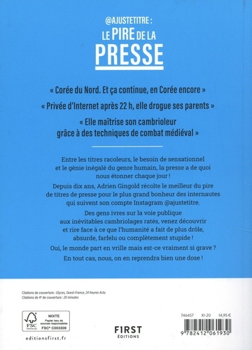 Format 150 x 210 ; 14, 95 ? 320 pages Dix ans des gros titres des petites affaires les plus drôles compilés dans cet ouvrage ! AJusteTitre, sur Instagram, fait rire plus de 122 000 personnes ! Et comment ? Avec de vrais (vrais de vrais) titres de journaux. Adrien Gingold, l'auteur (ou plutôt découvreur de ces pépites) fouille et déniche les perles de la presse depuis 10 ans. Le livre compile le meilleur de ces 10 ans, et c'est un autre regard sur l'actualité que nous découvrons, petites ou grosses actu, faits divers, politique ou société, tout y passe ! " Confinement : contrôlé à plus de 50 km de chez lui, il allait "chercher du cassoulet" " " En plein divorce, il brûle un million de dollars pour ne rien laisser à sa femme " " Ivre, il fonce sur le commissariat de Rochefort : "quand j'ai bu, je déteste la police" "