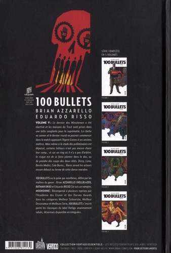 Volume V : Le dernier des Minutemen a été réactivé et les maisons du Trust sont prises dans une lutte sanglante pour la suprématie. La cloche va sonner et le dernier round va pouvoir commencer dans le match opposant l'Agent Graves à ses anciens maîtres. Mais même si le stade des préliminaires est dépassé, certains lutteurs n'ont pas encore choisi leur camp... et sur un ring où il n'y a pas d'arbitre, le risque est de se faire planter dans le dos, ou de prendre des coups des deux côtés. Dizzy, Lono, Benito Medici, Cole Burns... Rares seront les acteurs encore debout au terme de cette danse macabre. 100 Bullets ou le polar par excellence, défini par les maîtres du genre : Brian Azzarello (HELLBLAZER, BATMAN DKIII) et Eduardo Risso (Je suis un vampire, MOONSHINE). Récompensé à plusieurs reprises par l'Académie des Eisner et des Harvey Awards dans les catégories Meilleur Scénariste, Meilleur Dessinateur et Meilleure Série,100 Bullets s'inscrit parmi les classiques du label Vertigo unanimement salués, désormais disponible en intégrales.