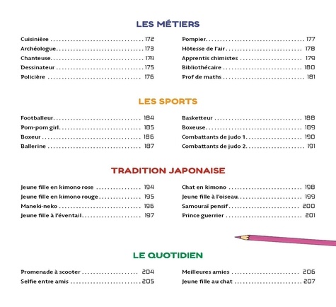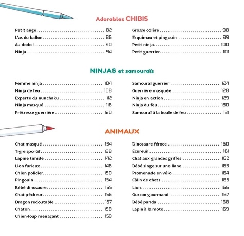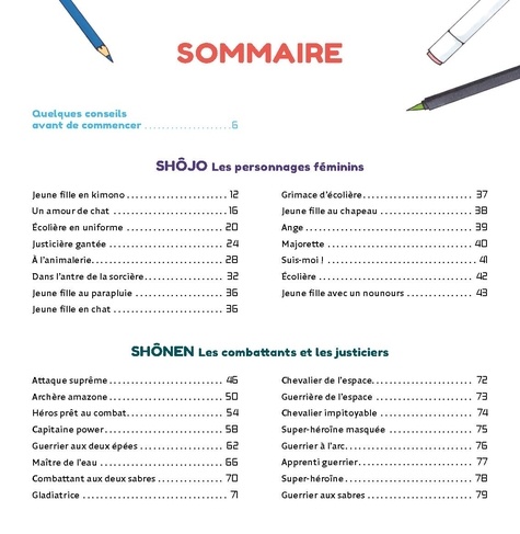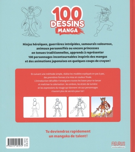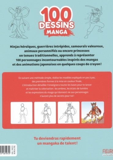 Ninjas héroïques, guerrières intrépides, samouraïs valeureux, animaux personnifiés, princesses en tenues traditionnelles... ce livre permet d'apprendre à dessiner des héros de mangas et d'animations japonaises étape par étape. Répartis en 9 chapitres, les 100 modèles de ce livre constituent une véritable base de données pour les mangakas en herbes qui prendront plaisir à réaliser d'incroyables personnages, depuis les premières formes jusqu'à la mise en couleur finale. Une introduction détaillée explique les bases pour maîtriser la colorisation : les ombres, les éclats de lumière et les expressions du visage qui donnent vie aux personnages. Un livre parfait pour devenir un mangaka de talent !