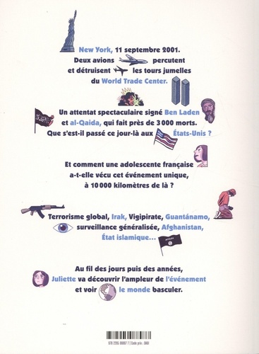 New York, 11 septembre 2001. Deux avions percutent et détruisent les tours jumelles du World Trade Center. Un attentat spectaculaire signé Ben Laden et al-Qaida, qui fait près de 3000 morts. Que s'est-il passé ce jour-là aux Etats-Unis ? Et comment une adolescente française a-t-elle vécu cet événement unique, à 10 000 kilomètres de là ? Terrorisme global, Irak, Vigipirate, Guantánamo, surveillance généralisée, Afghanistan, Etat islamique... Au fil des jours puis des années, Juliette va découvrir l'ampleur de l'événement et voir le monde basculer.