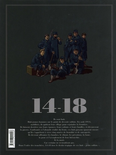 Ils sont huit. Huit jeunes hommes sur le point de devenir soldats. En août 1914, mobilisés, ils quittent leur village pour rejoindre la frontière. Ils laissent derrière eux leurs épouses, leurs enfants et leurs familles, et découvrent la guerre. Confrontés à l'absurde réalité du front, ces huit garçons ignorent encore qu'ils s'apprêtent à vivre cinq années de brutalité et de sauvagerie. Ils devront affronter les bombes, le climat, les privations, la boue, la peur et l'aveuglement de leur hiérarchie. Et la mort. Car certains ne reviendront pas. Dans l'enfer des tranchées, 14-18 tisse le destin tragique de ces huit "petits soldats".