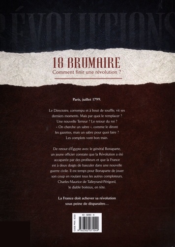 Cette nouvelle série thématique se consacre aux moments qui ont changé l'histoire de France et qui ont participé à forger notre nation. Illustration de couverture : Jean-Sébastien RossbachParis, novembre 1799. Le Directoire, corrompu vit ses derniers moments. Mais par quoi le remplacer ? Une nouvelle Terreur ? Le retour du roi ? "On cherche un sabre" , comme le diront les gazettes, mais un sabre pour quoi faire ? Un jeune officier revient d'égypte avec le général Bonaparte, il constate que la révolution a été accaparée par des profiteurs et que la France est à deux doigts de basculer dans une nouvelle guerre civile. Il est temps pour lui de jouer son coup en roulant tous les comploteurs, Talleyrand, le diable boîteux, en tête. La France doit finir sa révolution sous peine de disparaître...