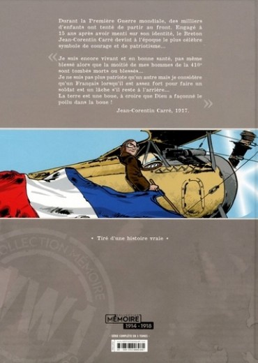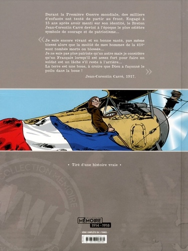 Durant la Première Guerre mondiale, des milliers d'enfants ont tenté de partir au front. Engagé à 15 ans après avoir menti sur son identité, le Breton Jean-Corentin Carré devint à l'époque le plus célèbre symbole de courage et de patriotisme... "Je suis encore vivant et en bonne santé, pas même blessé alors que la moitié de mes hommes de la 410e sont tombés morts ou blessés... Je ne suis pas plus patriote qu'un autre mais je considère qu'un Français lorsqu'il est assez fort pour faire un soldat est un lâche s'il reste à l'arrière... La terre est une boue, à croire que Dieu a façonné le poilu dans la boue !" Jean-Corentin Carré, 1917.