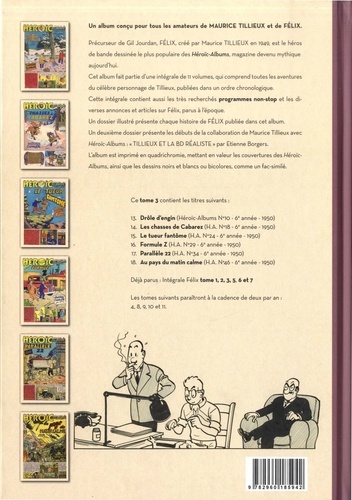 Précurseur de Gil Jourdan, Felix, créé par Maurice Tillieux en 1949, est le héros de bande dessinée le plus populaire des Néroïc-Albums, magazine devenu mythique aujourd'hui. Cet album fait partie d'une intégrale de 11 volumes, qui comprend toutes les aventures du célèbre personnage de Tillieux, publiées dans un ordre chronologique. Cette intégrale contient aussi les très recherchés programmes non-stop et les diverses annonces et articles sur Félix, parus à l'époque. Un dossier illustré présente chaque histoire de Felix publiée dans cet album. Un deuxième dossier présente les débuts de la collaboration de Maurice Tillieux avec Héroic-Albums : "Tillieux et la BD réaliste" par Etienne Borgers. L'album est imprimé en quadrichromie, mettant en valeur les couvertures des Héroic-Albums, ainsi que les dessins noirs et blancs ou bicolores, comme un fac-similé.