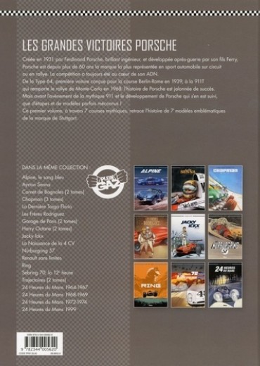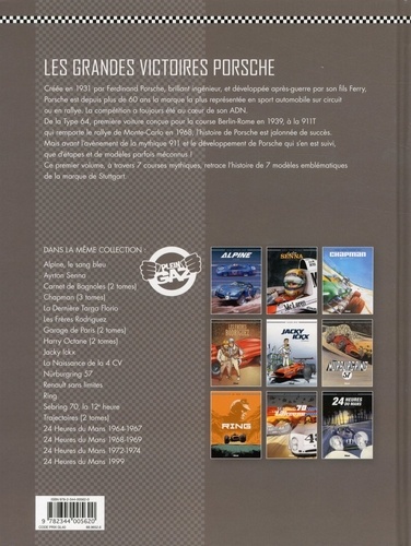 Créée en 1931 par Ferdinand Porsche, brillant ingénieur, et développée après-guerre par son fils Ferry, Porsche est depuis plus de 60 ans la marque la plus représentée en sport automobile sur circuit ou en rallye. La compétition a toujours été au coeur de son ADN. De la Type 64, première voiture conçue pour la course Berlin-Rome en 1939, à la 911T qui remporte le rallye de Monte-Carlo en 1968, l'histoire de Porsche est jalonnée de succès. Mais avant l'avènement de la mythique 911 et le développement de Porsche qui s'en est suivi, que d'étapes et de modèles parfois méconnus ! Ce premier volume, à travers 7 courses mythiques, retrace l'histoire de 7 modèles emblématiques de la marque de Stuttgart.