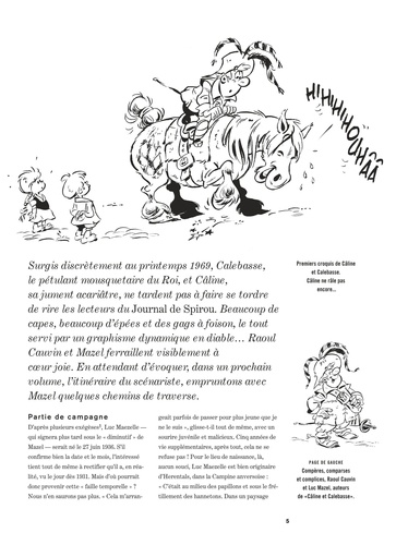 Jeune et fringant mousquetaire, Calebasse nous fait vivre de trépidantes aventures en compagnie de sa fidèle mais non moins caractérielle jument, l'irascible Câline. Malgré un succès certain, la série connaîtra peu de publications en album – ce qui explique que nombre d'histoires courtes de Câline et Calebasse soient depuis longtemps devenues introuvables. Cette intégrale vient combler ce manque, en réunissant, dans le présent volume, des histoires au long cours telles que "Les Mousquetaires", "Les Joyaux de la reine", ou encore "A l'ombre de la Bastille" ; des histoires courtes comme "Le Diamant noir" ou "Les Mousquetaires du printemps" ; ainsi que des illustrations et des couvertures parues dans Le journal de Spirou.