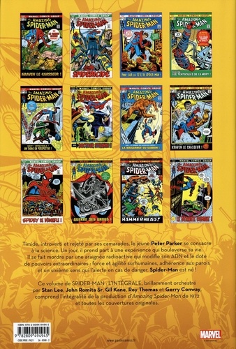 Pas de répit pour Spider-Man, qui va devoir affronter des ennemis aussi variés que l'Anti-Araignée, le Docteur Octopus, Kraven, Hammerhead et l'étrange Gibbon ! Heureusement, il pourra parfois compter sur l'aide d'amis super-héros comme le Docteur Strange. Panini Comics poursuit sa politique de réédition des Intégrales, permettant ainsi de redynamiser toute la gamme. Cet album est notable car il contient les derniers épisodes signés Stan Lee avant qu'il ne passe le flambeau à Gerry Conway. Timide, introverti et rejeté par ses camarades, le jeune Peter Parker se consacre à la science. Un jour, il prend part à une expérience qui bouleverse sa vie. Il se fait mordre par une araignée radioactive qui modifie son ADN et le dote de pouvoirs extraordinaires : force et agilité surhumaines, adhérence aux parois et un sixième sens qui l'alerte en cas de danger. Spider-Man est né ! Ce volume de Spider-Man : l'intégrale, brillamment orchestré par Stan Lee, John Romita Sr, Gil Kane, Roy Thomas et Gerry Conway, comprend l'intégralité de la production d'Amazing Spider-Man de 1972 et toutes les couvertures originales.
