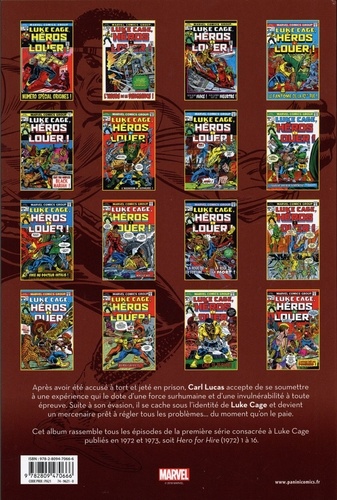 Après avoir été accusé à tort et jeté en prison, Carl Lucas accepte de se soumettre à une expérience qui le dote d'une force surhumaine et d'une invulnérabilité à toute épreuve. Suite à son évasion, il se cache sous l'identité de Luke Cage et devient un mercenaire prêt à régler tous les problèmes... du moment qu'on le paie. Cet album rassemble tous les épisodes de la première série consacrée à Luke Cage publiés en 1972 et 1973, soit Hero for Hire (1972) 1 à 16.