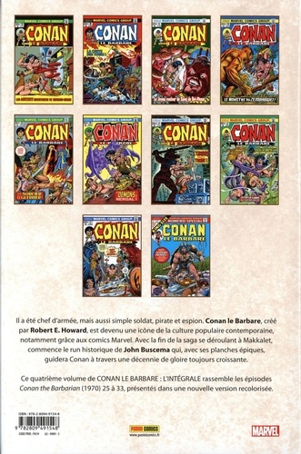 Alors que Conan fait désormais partie intégrante de l'univers Marvel, Panini Comics continue de vous proposer ses aventures classiques dans cette quatrième intégrale. Au programme, plusieurs aventures courtes et une saga en trois parties opposant Conan à sept sorciers surpuissants. Des épisodes historiques ! Réalisée par le tandem Roy Thomas / John Buscema, cette nouvelle intégrale de Conan marque un tournant, la quasi-totalité de l'album n'ayant pas été publiée en France depuis 1978 !