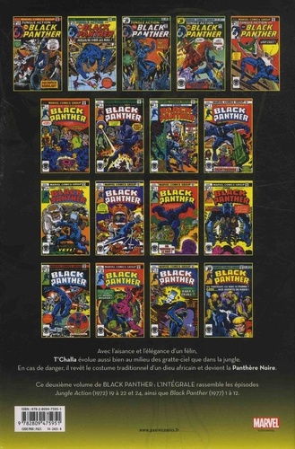Avec l'aisance et l'élégance d'un félin, T'Challa évolue aussi bien au milieu des gratte-ciel que dans la jungle. En cas de danger, il revêt le costume traditionnel d'un dieu africain et devient la Panthère Noire. Ce deuxième volume de BLACK PANTHER : L'INTEGRALE rassemble les épisodes Jungle Action (1972) 19 à 22 et 24, ainsi que Black Panther (1977)1 à 12.