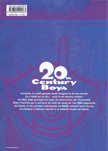 Il était une fois un petit garçon qui avait imaginé la fin du monde. Cela ne semblait être qu'un jeu d'enfant et pourtant, ce fût bien plus que cela... Alors qu'Ami peaufine son plan pour détruire l'humanité, l'homme qui a survécu au "nouvel an sanglant" approche de Tokyo. Les compagnons de Kenji se rassemblent progressivement. Le compte à rebours avant l'ultime combat a commencé. Une série qui n'est plus à présenter ! Ce thriller passionnant s'est vu décerner le prix des éditions Kodansha, fait rarissime puisqu'il était publié par un autre éditeur. En France, le manga de Naoki Urasawa a reçu le prix du meilleur scénario Angoulême 2004 et a été couronné d'un Japan Expo Awards en 2008. Cette nouvelle édition bénéficie de pages couleur, d'une traduction revue, d'une fin inédite qui reprend la conclusion de l'adaptation en film de 20th Century Boys et d'un marque-page offert avec chaque tome.