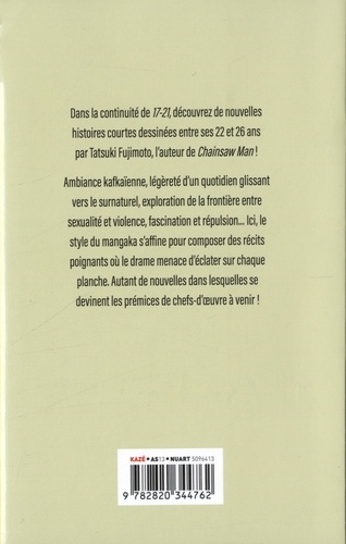Dans la continuité de 17-21, découvrez de nouvelles histoires courtes dessinées entre ses 22 et 26 ans par le génial Tatsuki Fujimoto, l'auteur de Chainsaw Man ! Ambiance kafkaïenne, légèreté d'un quotidien glissant dans le surnaturel, exploration de la frontière entre sexualité et violence, fascination et répulsion... Ici, le style du mangaka s'affine pour composer des récits poignants où le drame menace d'éclater sur chaque planche. Autant de nouvelles dans lesquelles se cachent les bourgeons de chefs-d'oeuvre à venir !