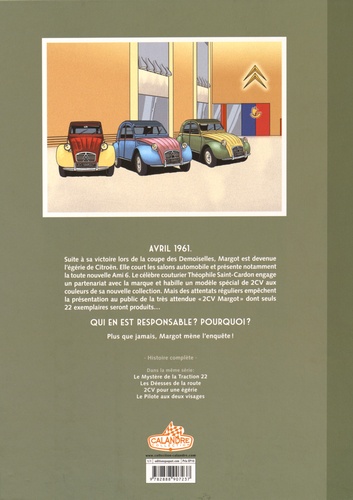 AVRIL 1961. Suite à sa victoire lors de la coupe des Demoiselles, Margot est devenue l'égérie de Citroën. Elle court les salons automobile et présente notamment la toute nouvelle Ami 6. Le célèbre couturier Théophile Saint-Cardon engage un partenariat avec la marque et habille un modèle spécial de 2CV aux couleurs de sa nouvelle collection. Mais des attentats réguliers empêchent la présentation au public de la très attendue "2CV Margot" dont seuls 22 exemplaires seront produits... QUI EN EST RESPONSABLE ? POURQUOI ? Plus que jamais, Margot mène l'enquête !