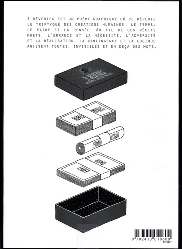 Toujours fasciné par le rapport entre forme et fond, Marc- Antoine Mathieu poursuit ses expérimentations. Il accentue la mutation du livre vers l'objet et délaisse un temps la dramaturgie pour l'expression poétique. 3 rêveries est un poème graphique dans lequel se déploie, sous la forme d'une rêverie muette, le triptyque des créations humaines : le temps, l'outil et la pensée. L'errance et la nécessité, l'adversité et la réalisation, la contingence et la logique agissent toutes ici, invisibles et indicibles. L'auteur donne à chaque rêve sa forme imprimée idéale : leporello, jeu de cartes et ruban panoramique.