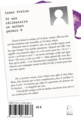 Toute la boite la voulait, je l'ai donc voulue. Elle me laissait des semaines sans nouvelles, je l'ai donc aimée. Pourtant tout le monde le sait, on ne tombe jamais aussi bas que lorsque l'on tombe amoureux. Quand une fille vous appelle c'est mauvais signe, il y a les textos pour les "Sa va ? " ou les "tu fé koi se soir ? " ou autres messages codés qui signifient "Du sexe ce soir ça te dit ? " . Mais quand elle vous dit "faut qu'on parle" c'est franchement inquiétant. Ils devraient relancer une campagne contre le sida à la télé, j'aurais peut être mis une capote. Par ce premier roman, Isaac Frelon nous offre le One Man Show d'un homme qui se livre complètement, pour le meilleur et pour le pire. Un homme qui refuse la suprématie des femmes sur les hommes... et l'inégalité des sexes. Cette façade cynique cache la douleur touchante d'un père et son combat pour son enfant.