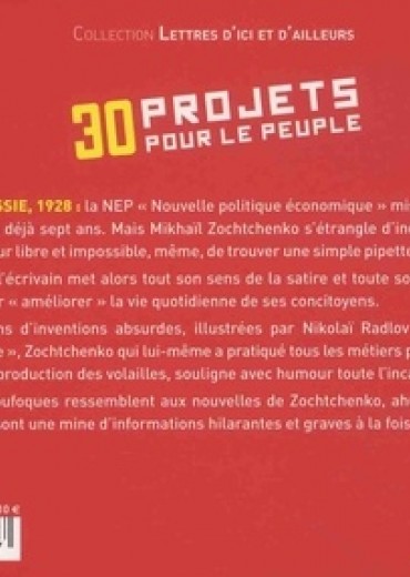 Russie, 1928 : la NEP "Nouvelle politique économique" mise en oeuvre par Lénine au printemps 1921 a déjà sept ans. Mais Mikhaïl Zochtchenko s'étrangle d'indignation : sept années de commerce intérieur libre et impossible, même, de trouver une simple pipette à compter les gouttes ! Devant un tel bilan, l'écrivain met alors tout son sens de la satire et toute son inventivité au service de la collectivité pour "améliorer" la vie quotidienne de ses concitoyens. Avec ces propositions d'inventions absurdes, illustrées par Nikolaï Radlov le génial caricaturiste du journal "Crocodile", Zochtchenko qui lui-même a pratiqué tous les métiers possibles, de cordonnier à contrôleur de la reproduction des volailles, souligne avec humour toute l'incapacité du régime. Ces trente projets loufoques ressemblent aux nouvelles de Zochtchenko, ahurissantes de drôleries et de férocité. Elles sont une mine d'informations hilarantes et graves à la fois sur la Russie de 1928.