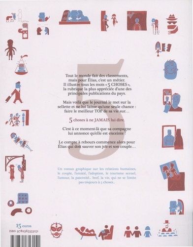 Tout le monde fait des classements, mais pour Elias, c'est un métier. Il illustre tous les mois "5 CHOSES", la rubrique la plus appréciée d'une des principales publications du pays. Mais voilà que le journal le met sur la sellette et ne lui laisse qu'une seule chance : faire le meilleur TOP de sa vie sur... 5 choses à ne JAMAIS lui dire. C'est à ce moment-là que sa compagne lui annonce qu'elle est enceinte ! Le compte à rebours commence alors pour Elias qui doit sauver son job et son couple... Un roman graphique sur les relations humaines, le couple, l'amitié, l'adoption, le tourisme sexuel, l'amour, la paternité... bref, la vie, qui ne se limite pas toujours à 5 choses...