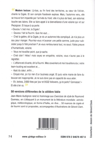" Modern lexicon : Là-bas, au fin fond des territoires, au coeur de l'olivier, chante la Cigale. Et son compte Facebook explose. Mais, l'automne venu, elle se trouve fort impactée par l'arrivée du froid : elle n'a plus de food, son estomac touche ses talons. Elle va faire appel à la bienveillance d'une voisine qui vit sur Perpignan. Et toque à sa porte : "Coucou ! c'est moi, la Cigale ! - Coucou ! fait la Fourmi. Que me vaut... - C'est la galère, dit la Cigale, je vis un automne très compliqué. Je n'ai plus un sou pour manger. Pourriez - vous m'avancer une petite somme, juste pour subsister jusqu'à l'été prochain ? Je vous rembourserai tout, no souci. Faites preuve d'humanitude, voisine. - Vous ne travaillez point, que je sache. - C'est clair ! hélas ! mais soyez en empathie, voisine, vous n'aurez pas à le regretter. - L'affaire est clivante, dit la Fourmi. Mes coworkers et moi travaillons dur, notre team-buiding est excellent et... - Ayez du coeur, enfin... - Croyez - moi, je n'ai rien d'un business angel. Et puis votre manie de faire du boucan est inappropriée. Je ne suis donc pas en capacité de vous aider. - Eh, boloss, 3000 likes par jour et 9532 followers, ça te parle ? Connasse ! " Et elle s'en va."
