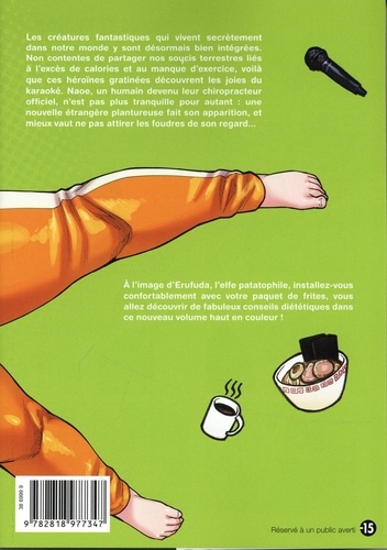 Les créatures fantastiques qui vivent secrètement dans notre monde y sont désormais bien intégrées. Non contentes de partager nos soucis terrestres liés à l'excès de calories et au manque d'exercice, voilà que ces héroïnes gratinées découvrent les joies du karaoké. Naoe, un humain devenu leur chiropracteur officiel, n'est pas plus tranquille pour autant : une nouvelle étrangère plantureuse fait son apparition, et mieux vaut ne pas attirer les foudres de son regard... A l'image d'Erufuda, l'elfe patatophile, installez-vous confortablement avec votre paquet de frites, vous allez découvrir de fabuleux conseils diététiques dans ce nouveau volume haut en couleur ! Réservé à un public averti.