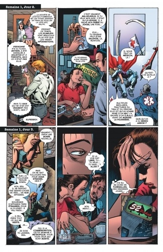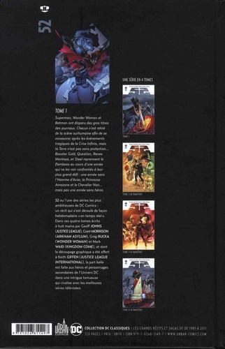 Superman, Wonder Woman et Batman ont disparu des gros titres des journaux. Chacun s'est retiré de la scène surhumaine afin de se ressourcer après les événements tragiques de la Crise Infinie, mais la Terre n'est pas sans protection... Booster Gold, Question, Renee Montoya, et Steel reprennent le flambeau au cours d'une année qui va les voir confrontés à leur plus grand défi : une année sans l'Homme d'Acier, la Princesse Amazone et le Chevalier Noir... mais pas une année sans héros. Contenu : 52 #1-13.