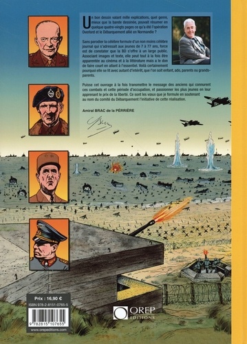 Un bon dessin valant mille explications, quel genre, mieux que la bande dessinée, pouvait résumer en quelque quatre-vingts pages ce qu'a été l'opération Overland et le Débarquement allié en Normandie ? Sans parodier la célèbre formule d'un non moins célèbre journal qui s'adressait aux jeunes de 7 à 77 ans, force est de constater que la BD s'offre à un large publia Associant images et texte, elle peut tout à la lois d'Ire apparentée au Cinéma et à la littérature mais a le don de faire court en allant à l'essentiel. Voilà certainement pourquoi elle se lit avec autant d'intérêt, que l'an soit enfant, ado, parents ou grands- parents. Puisse cet ouvrage à la fois transmettre le message des anciens qui connurent ces combats et cette période d'occupation, et passionner les plus jeunes en leur apprenant le prix de la liberté. Ce sont les mus que je formule en soutenant au nom du comité du Débarquement l'initiative de cette réalisation. Amiral Brac de la Pérrière.
