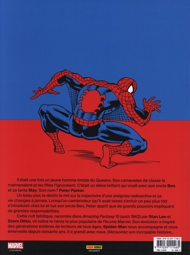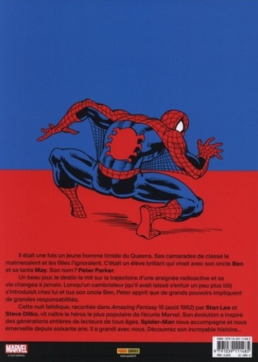 Il était une fois un jeune homme timide du Queens. Ses camarades de classe le malmenaient et les filles l'ignoraient. C'était un élève brillant qui vivait avec son oncle Ben et sa tante May. Son nom ? Peter Parker. Un beau jour, le destin le mit sur la trajectoire d'une araignée radioactive et sa vie changea à jamais. Lorsqu'un cambrioleur (qu'il avait laissé s'enfuir un peu plus tôt) s'introduisit chez lui et tua son oncle Ben, Peter apprit que de grands pouvoirs impliquent de grandes responsabilités. Cette nuit fatidique, racontée dans Amazing Fantasy 15 (août 1962) par Stan Lee et Steve Ditko, vit naître le héros le plus populaire de l'écurie Marvel. Son évolution a inspiré des générations entières de lecteurs de tous âges. Spider-Man nous accompagne et nous émerveille depuis soixante ans. Il a grandi avec nous. Découvrez son incroyable histoire...