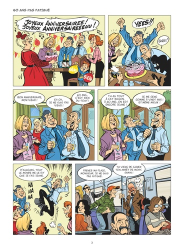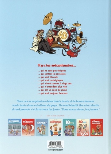 Il y a les soixantenaires... qui ne sont pas fatigués, qui sentent la poussière, qui sont étourdis, qui sont nostalgiques, qui vivent comme à vingt ans, qui n'entendent plus rien, qui ont un coup de jeune, qui sont toujours heureux. Tous ces sexagénaires débordants de vie et de bonne humeur sont réunis dans cet album de gags. Ils vont bientôt être à la retraite et vont pouvoir s'éclater tous les jours. Vous avez raison, les jeunes ! L'âge, c'est dans la tête ! Certains l'assument sans complexe, d'autres en font une véritable maladie, mais une chose est sûre : soixante ans, c'est un cap ! Il faut dire qu'entre vos proches qui ont le chic pour vous offrir une canne à votre anniversaire, les jeunes qui vous laissent le strapontin dans le métro ou le médecin qui vous prend déjà pour un grabataire, ce sont, au quotidien, plein de petits signaux qui sont sans arrêt là pour vous rappeler votre âge - et ce, même si la mémoire commence à vous jouer des tours. Mais, comme on dit, l'âge c'est dans la tête, alors autant accepter ça avec le sourire ! Que vous soyez mamie comblée, jeune retraité, vieux beau ou cougar prédatrice, réjouissez-vous : ce nouvel album de gags en une planche met à l'honneur toutes celles et ceux qui entrent dans l'âge vénérable de la soixantaine !