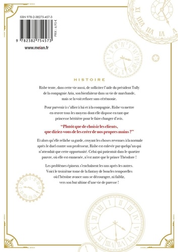 Rishe tente, dans cette vie aussi, de solliciter l'aide du président Tully de la compagnie Aria, son bienfaiteur dans sa vie de marchande, mais se la voit refuser sans cérémonie. Pour parvenir à s'allier à lui et à la compagnie, Rishe va mettre en oeuvre tous les moyens dont elle dispose en tant que princesse héritière pour le faire changer d'avis. "Plutôt que de choisir les clients, que diriez-vous de les créer de nos propres mains ? " Et alors qu'elle relâche sa garde, croyant les choses revenues à la normale après le duel contre son professeur, Rishe est enlevée par quelqu'un qui n'attendait que cette opportunité. Celui qui patientait dans le quartier pauvre, où elle est emmenée, n'est autre que le prince Théodore ! Les problèmes épineux s'enchaînent les uns après les autres.