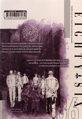 Shin, le chef de l'escadron Spearhead, a désormais le poste de défense le plus important. Léna, quant à elle, vient de prendre conscience de ce que les Eighty-Six, autrement appelés les Coloratas pouvaient ressentir envers les Albas comme elle. L'opératrice de l'armée de la République saisit avec acuité toute son ignorance... Lors dune nouvelle offensive. Léna perçoit, au milieu des lamentations la voix de Kaie..