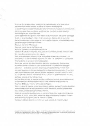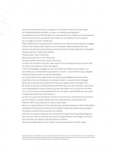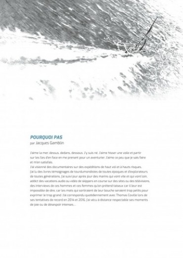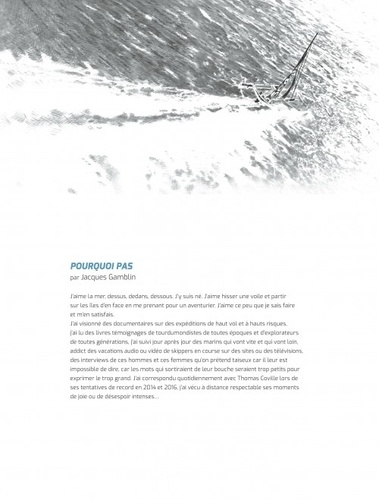 Après avoir signé deux albums sur le Vendée Globe, Alexandre Chenet et Renaud Garreta ont suivi pendant plusieurs mois Thomas Coville, l'un des plus grands skippers au monde et tentent de comprendre "ce qui peut se passer dans la tête d'un marin" , notamment lors d'un tour du monde en solitaire mémorable. Une bande dessinée qui se présente comme un documentaire passionnant et qui sortira à une période où l'actualité voile battra son plein avec Le Trophée Jules Verne et Le Vendée Globe. Cet ouvrage s'adresse à tous les publics amoureux d'aventure et désireux de mieux comprendre cette formidable aventure humaine, technologique et sportive.