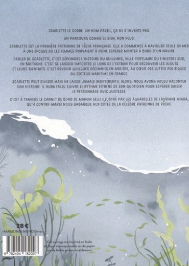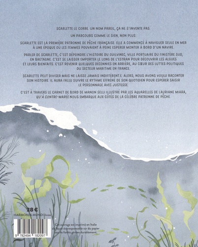 Scarlette Le Corre. Un nom pareil, ça ne s'invente pas. Un parcours comme le sien non plus. Scarlette est la première patronne de pêche française. Elle a commencé à naviguer seule en mer à une époque où les femmes pouvaient à peine espérer monter à bord d'un navire. Parler de Scarlette, c'est dépeindre l'histoire du Guilvinec, ville portuaire du Finistère sud, en Bretagne. C'est se laisser emporter le long de l'estran pour découvrir les algues et leurs bienfaits. C'est revenir quelques décennies en arrière, au coeur des luttes politiques du secteur maritime en France. Scarlette peut diviser mais ne laisse jamais indifférent. e. Alors, nous avons voulu raconter son histoire. Il aura fallu suivre le rythme effréné de son quotidien pour espérer saisir le personnage avec justesse. C'est à travers le carnet de bord de Manon Selli illustré par les aquarelles de Lauriane Miara, qu'A contre-marée nous embarque aux côtés de la célèbre patronne de pêche.