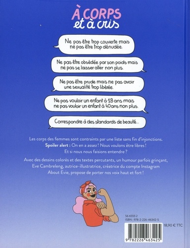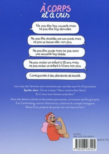 "Ne pas être trop couverte, mais ne pas être trop dénudée". "Ne pas être obsédée par son poids mais ne pas se laisser aller non plus". "Ne pas être prude mais aussi ne pas avoir une sexualité trop libérée". "Ne pas vouloir un enfant à 18 ans mais ne pas vouloir un enfant à 40 ans non plus". "Correspondre à des standards de beauté". Les corps des femmes sont contraints par une liste sans fin d'injonctions. Spoiler alert : On en a assez ! Nous voulons être libres ! Et si nous nous faisions entendre ? Avec des dessins colorés et des textes percutants, un humour parfois grinçant, Eve Cambreleng, autrice-illustratrice, créatrice du compte Instagram About Evie, propose de porter nos voix haut et fort ! La révolution est en marche !