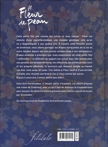 Cette petite fille pas comme les autres va vous remuer : Fleur est atteinte d'une neurofibromatose, une maladie génétique rare qu'on lui a diagnostiquée à ses quatre ans. A travers cette histoire pleine de tendresse, nous allons partager tes étapes marquantes de la vie de notre héroïne depuis ses plus jeunes années jusqu'à son adolescence. Etapes anodines à première vue, mais essentielles de cette petite fille " différente " : la difficulté du rapport aux autres pour elle comme pour ses parents, les baisses de moral, les réflexions, les envies de bien faire et les progrès effectués, te parcours pas toujours simple qu'impose son état, mais aussi les joies ! Car même si Fleur souffre d'une terrible maladie, elle réclame son droit à rire, à vivre comme les autres. Et puis à seize ans, l'amour donne des ailes ! Sans être moralisateur, ni vouloir servir d'exemple, cet album propose une vision de l'intérieur, avec ce qu'il faut de distance et d'autodérision pour essayer de rendre la lecture prenante pour chacun, concerné ou pas par la maladie. Un récit touchant et finalement éminemment joyeux.