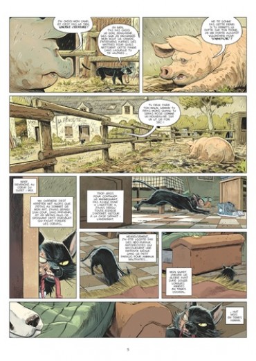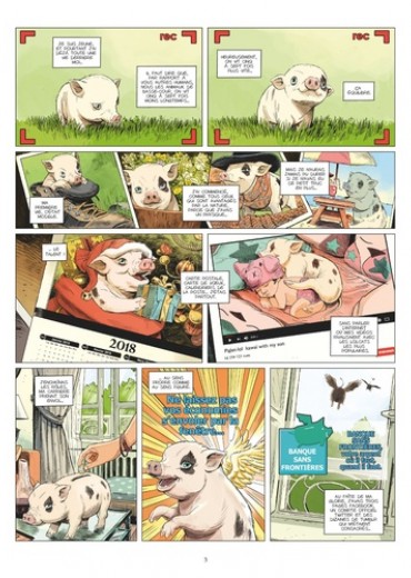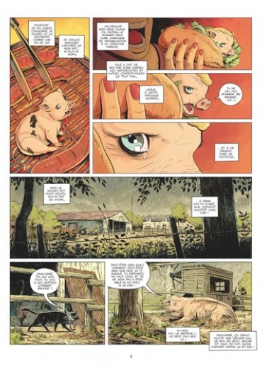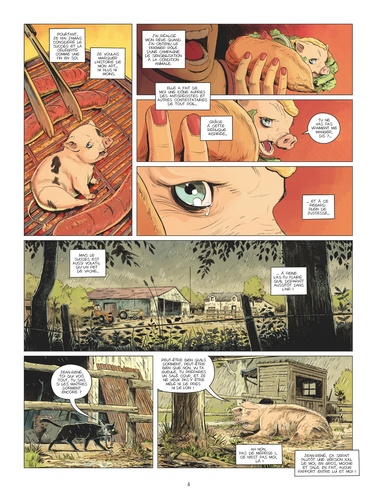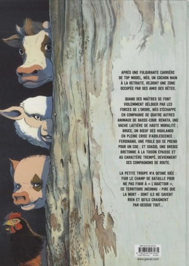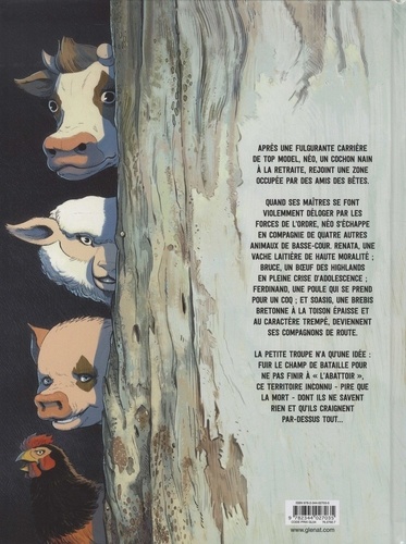 Ne le prenez pas pour un jambon ! Poussé à la retraite après une fulgurante carrière de modèle, Néo - un cochon nain en pleine croissance - rejoint une Z. A. D. où il est accueilli par des amis des bêtes dans une ferme occupée. Quand ceux-ci se font violemment déloger par les forces de l'ordre, Néo s'enfuit en compagnie de quatre autres animaux de basse-cour, seuls rescapés du champ de bataille. Il y a Renata, la vache laitière, moulin à paroles et serial gaffeuse ; Bruce le boeuf des Highlands, qui traverse une violente crise d'adolescence ; Ferdinand, la poule qui se prend pour un coq ; et Soizic, la brebis bretonne à la toison épaisse et au caractère bien trempé. La petite troupe doit quitter cette zone de guerre ou ils seront capturés et envoyés à l'Abattoir. Maintenant, il leur faut trouver une nouvelle terre d'accueil... Les animaux sont des êtres vivants doués de sensibilité" , parait-il. C'est même inscrit dans la loi. Il ne leur manquait que la parole et c'est désormais chose faite. Stéphane Betbeder plonge ses personnages à quatre (et deux) pattes dans une odyssée animalière que n'auraient pas renié les plus grands héros du genre humain. Cette nouvelle série trépidante abordera les thèmes touchant à la condition animale (abattoirs, traitement réservé aux animaux domestiques, tests pharmacologiques, combats d'animaux, etc.) ; Chaque album interrogeant le rapport particulier que nous entretenons avec les autres espèces qui partagent avec nous la planète.