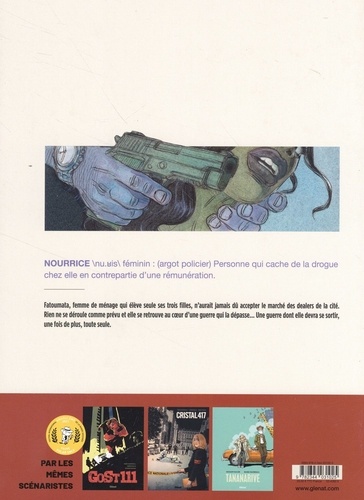 La trajectoire périlleuse d'une mère de famille dans une cité tenue par des trafiquants. nourrice \nu. ? is\, n. f. : (argot policier)Personne qui cache de la drogue chez elle, en contrepartie d'une rémunération. Fatoumata, femme de ménage qui élève seule ses trois filles, n'aurait jamais dû accepter le marché des dealers de la cité. Rien ne se déroule comme prévu et elle se retrouve au coeur d'une guerre qui la dépasse... Une guerre dont elle devra se sortir, une fois de plus, toute seule. Roman noir, portrait de femme, A mourir entre les bras de ma nourrice est une oeuvre pleine de suspense et à la mise en scène remarquablement orchestrée. Le duo de scénaristes Mark Eacersall et Henri Scala, qui a déjà fait ses preuves (GoSt 111, Cristal 417) est cette fois-ci accompagné du dessinateur Raphaël Pavard. Ce prodige signe ici son premier album, en couleurs directes, d'une force graphique sans précédent, rappelant parfois les grandes heures d'un Baru, version réaliste. Le récit offre une immersion à hauteur d'homme (en l'occurrence ici, de femme) dans l'univers d'une cité de la drogue. Aussi documenté et haletant qu'une saison de The Wire ou un film de Jacques Audiard, A mourir entre les bras de ma nourrice met en scène une héroïne touchante et originale, prête à tout pour améliorer son quotidien et protéger les siens.