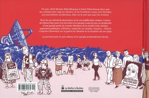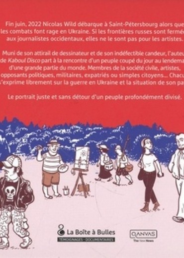 Fin juin 2022, alors que les télévisions de l'aéroport de Dubaï annoncent les dernières avancées russes en Ukraine, Nicolas Wild s'apprête à embarquer pour Saint-Pétersbourg. Si les frontières russes sont fermées aux journalistes occidentaux, la réglementation n'a pas changé pour les artistes. Equipé de son attirail de dessinateur et un poil stressé, l'auteur de Kaboul Disco part à la rencontre d'un peuple coupé du jour au lendemain d'une grande partie du monde. Durant deux semaines, accompagné d'une interprète, il ira à la rencontre d'un large panel de résidents russes : membres de la société civile, artistes, opposants politiques, militaires, expatriés et simples citoyens, tous passeront sous le crayon de Nicolas pour exprimer leurs vues sur la guerre en Ukraine et la situation de leur pays. Parfois amusant, parfois triste voire inquiétant mais toujours instructif, A quoi pensent les Russes est un album nécessaire qui offre un contrepoint saisissant sur la situation aux frontières de l'Europe, et qui dresse le portrait juste et sans détour d'un peuple divisé, qui approuve ou subit la dérive autoritaire de ses dirigeants.