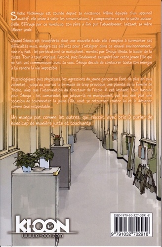 Shoko Nishimiya est sourde depuis sa naissance. Même équipée d'un appareil auditif, elle peine à saisir les conversations, à comprendre ce qui se passe autour d'elle. Effrayé par ce handicap, son père a fini par l'abandonner, laissant Sa mère l'élever seule. Quand Shoko est transférée dans une nouvelle école, elle s'emploie à surmonter ses difficultés mais, malgré ses efforts pour s'intégrer dans ce nouvel environnement, rien n'y fait : les persécutions se multiplient, menées par Shoya lshida, le leader de la classe. Tour à tour intrigué, fasciné, puis finalement exaspéré par cette jeune fille qui ne sait pas communiquer avec sa voix, Shoya décide de consacrer toute son énergie à lui rendre la vie impossible. Psychologiques puis physiques, les agressions du jeune garçon se font de plus en plus violentes... jusqu'au jour où la brimade de trop provoque une plainte de la famille de Shoko, ainsi que l'intervention du directeur de l'école. A cet instant, tout bascule pour Shoya : ses camarades, qui jusque-là ne manquaient pas eux non plus une occasion de tourmenter la jeune fille, vont se retourner contre lui et le désigner comme seul responsable. Un manga pas comme les autres, qui réussit avec brio à parler de handicap de manière juste et touchante !