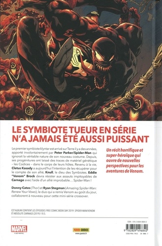 Carnage est de retour, plus puissant que jamais ! Cletus Kasady, investi de nouveaux pouvoirs, s'est fixé une mission : massacrer tous ceux qui n'ont jamais porté un symbiote. Et autant dire qu'à New York, ils sont nombreux, même parmi les super-héros Marvel. Deadpool, Hulk, Captain Marvel, les Fantastiques, ils sont tous des cibles ! C'est le début d'un affrontement sanglant et terrifiant que Spider-Man et Venom ne pourront évidemment pas mener seuls. Avengers, rassemblement ! Donny Cates (Venom, Guardians of the Galaxy, Silver Surfer : Black) est rapidement devenu l'un des principaux architectes de la galaxie Marvel. Alors que son prochain crossover, King in Black débute le mois prochain, redécouvrez cette saga qui constitue en quelque sorte le prologue à l'arrivée de Knull, le dieu des Symbiotes, sur Terre.
